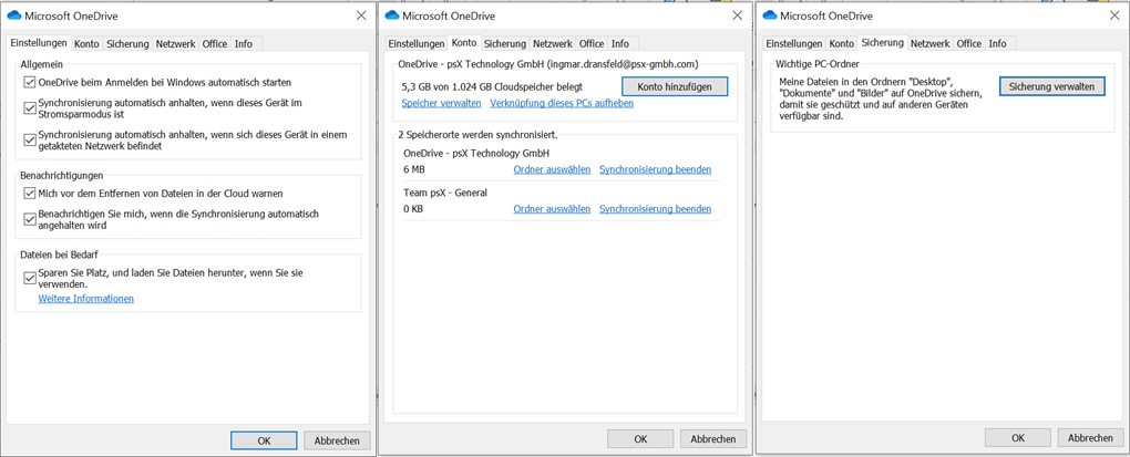 Oben in den Bildern sind die Standardeinstllungen von OneDrive angezeigt. Am sinnvollsten ist es, diese beizubehalten. Eine Synchronisation ist natürlich auch in einem mobilen Netz möglich. Hierzu muss dann der 3. Haken unter "Einstellungen" entfernt werden. Sollte, aus welchen Gründen auch immer, die Synchronisation beendet werden, ist die unter den "Konto" möglich.